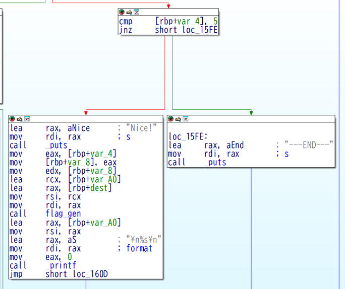 [rbp+var4]가 5이면 flag_gen이 있는 쪽으로 분기하는 것을 알 수 있다.