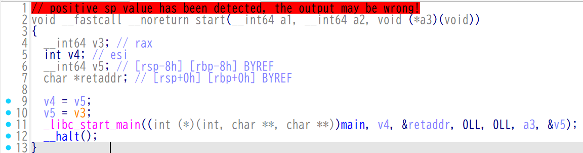 f5를 누르면 디컴파일링된 결과를 확인할 수 있는데, start 함수를 찍고 들어왔는데 아무래도 여기는 아닌 것 같다.
